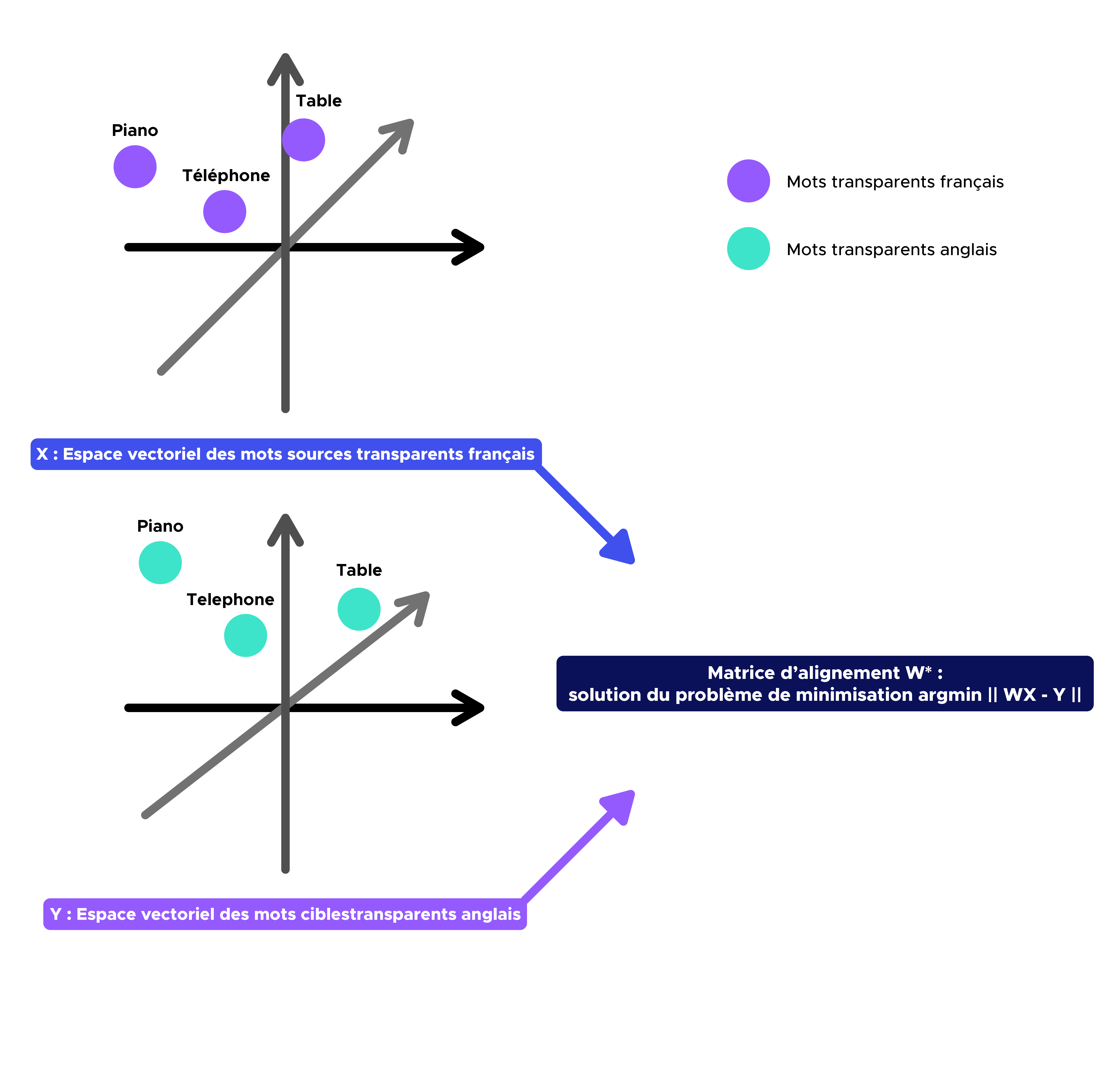 Transparente Wörter sind für die Konstruktion des Übersetzungsalgorithmus entscheidend, da sie Bezugspunkte sind, die es ermöglichen, die beiden Vektorräume der Einbettungen nach Anwendung der Ausrichtungsmatrix W auszurichten. Mit anderen Worten: Die transparenten Wörter werden die geometrische Transformation zwischen den beiden Untervektorräumen bestimmen.