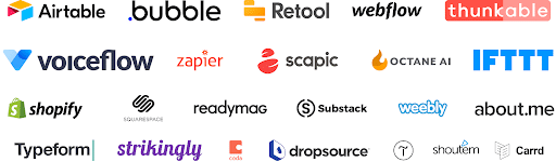 Es gibt eine beträchtliche Anzahl von No-Code-Tools für jeden Zweck, sei es die Erstellung von Websites, mobilen Anwendungen, Chatbots, die Einrichtung von APIs oder die Verwaltung von Datenbanken. Es ist schwierig, eine vollständige Liste all dieser Tools zu erstellen, aber wir können die beliebtesten nennen, darunter: Bubble, Airtable, PowerApps, Glide, Zapier, Adalo, WordPress…