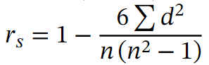 Die Spearman-Korrelation wird häufig für Daten verwendet, die aus Ausreißern bestehen. Um die Spearman-Korrelation zu messen, wird als Indikator der Spearman-Koeffizient rs verwendet, der auch als Rangkoeffizient bezeichnet wird und in der folgenden Formel angegeben ist. In dieser Formel gibt die Variable n die Anzahl der Punkte in der Datenreihe an. Die Variable d ist das Quadrat der Differenz der Ränge zwischen jedem Punkt mit den Koordinaten (x,y).