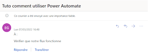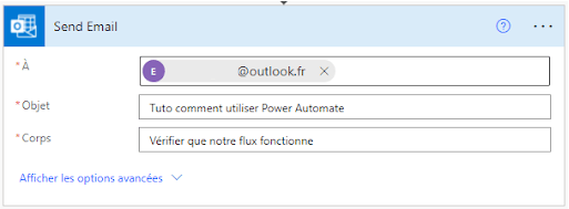 Wir wählen die E-Mail-Adresse, an die du die E-Mail erhalten möchtest, als Betreff: Tuto wie man Power Automate benutzt und als Textkörper: Überprüfen, ob unser Feed funktioniert.