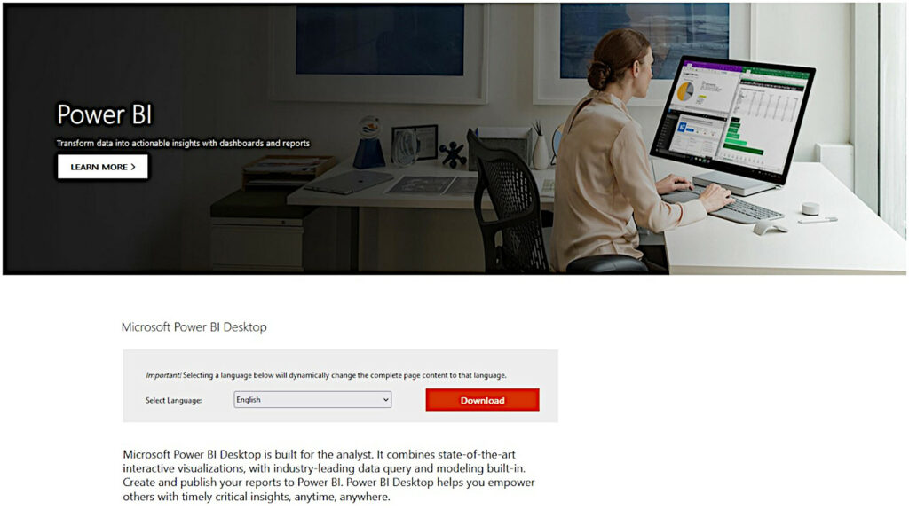 Wähle „Power BI Desktop“: Auf dieser Seite findest du den Abschnitt für Power BI Desktop. Klick darauf, um zur Download-Seite zu gelangen.