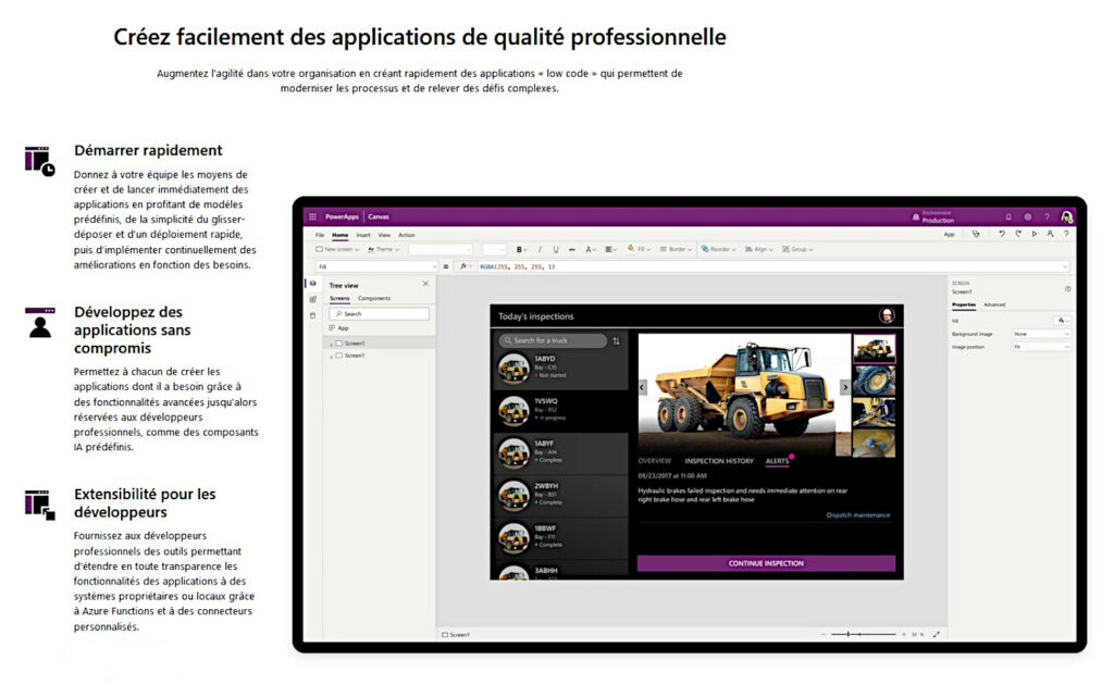 Diese Plattform zur Entwicklung von Mobil- und Webanwendungen ermöglicht es Bürgerentwicklern“, von Fähigkeiten zu profitieren, die früher nur High-End-Entwicklungswerkzeugen vorbehalten waren. Die mit PowerApps erstellten Anwendungen sind mit Android, iOS, Windows und jedem Internetbrowser kompatibel.
