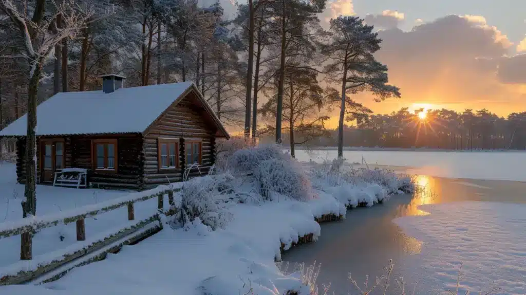 /imagine „Einsame Holzhütte am Rand eines zugefrorenen Sees, rosafarbener Himmel beim Sonnenaufgang, sanftes Licht und friedliche Atmosphäre –ar 16:9 –v 6 –style raw –stylize 500 –chaos 20“