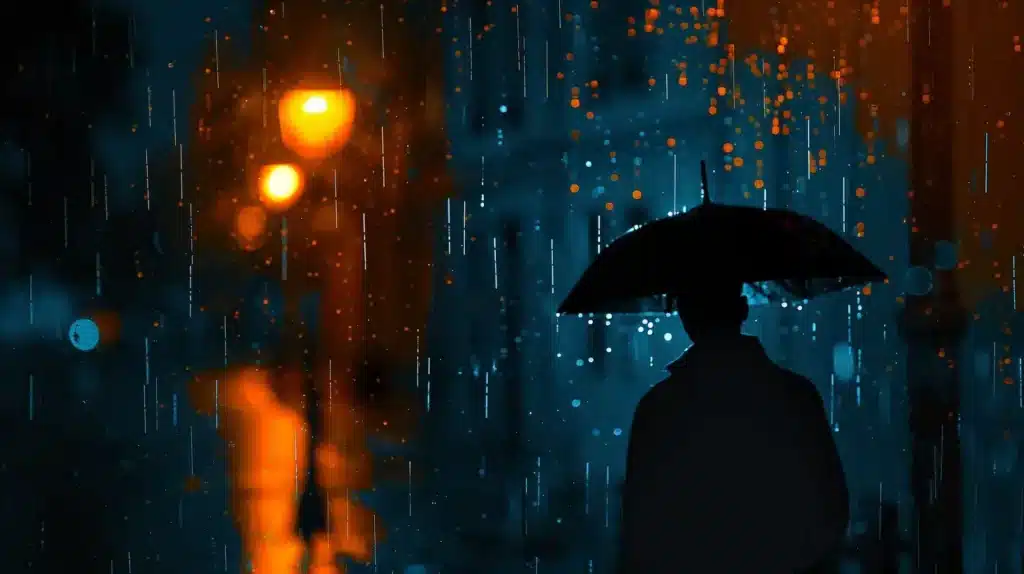 /imagine „Einsamkeit, Silhouette eines Mannes unter einer Straßenlaterne, Mitternachtsblau und sanftes Orange, leichter Regen –v 6 –style raw“