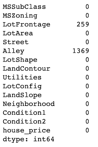 In der Kategorie numerische Variablen gibt es 259 fehlende Werte für die Variable ‚LotFrontage‘.