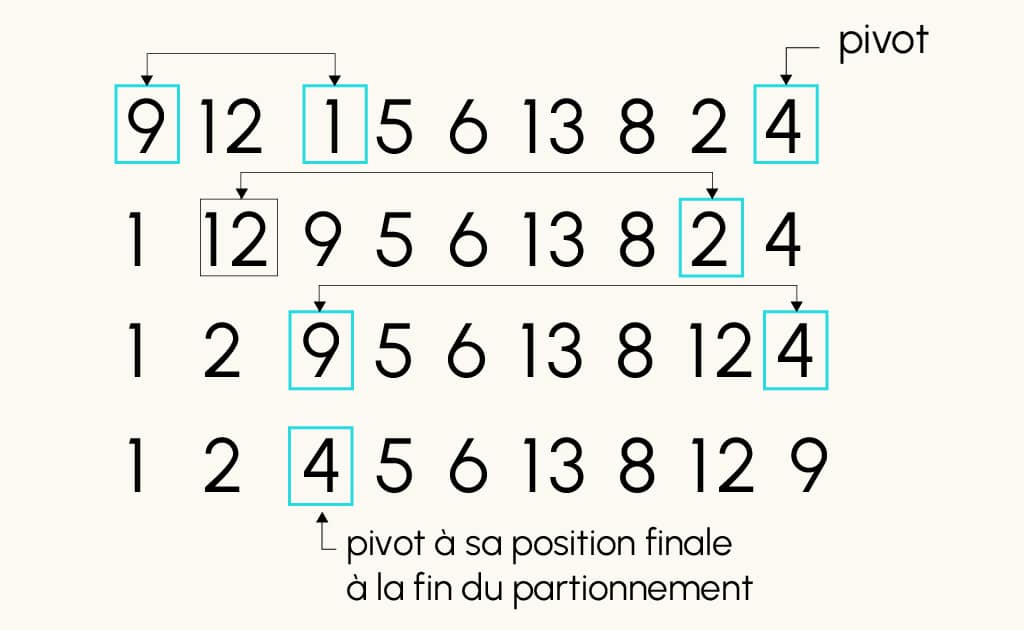Der Partitionierungsalgorithmus ist ein iterativer Algorithmus, der die gesamte zu sortierende Tabelle durchläuft, um alle Elemente, die kleiner als der Pivot sind, links von diesem zu platzieren und alle Elemente, die größer als der Pivot sind, rechts von diesem zu platzieren.