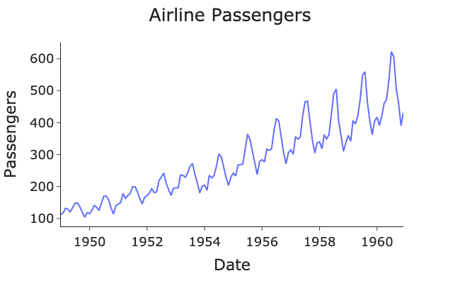 Saisonale Schwankungen können in kurzen Zeiträumen auftreten, wie z. B. bei den monatlichen Verkäufen eines Unternehmens, oder in längeren Zeiträumen, wie z. B. bei Klimadaten. Durch die Einbeziehung einer saisonalen Komponente (S) kann das SARIMA-Modell diese wiederkehrenden Muster modellieren und die Prognosen verbessern. Ein Beispiel für eine nicht-stationäre Zeitreihe mit Saisonalität findest du im folgenden Diagramm, das die jährlichen Passagierzahlen einer Fluggesellschaft darstellt.
