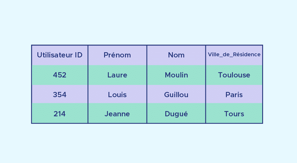 BenutzerId: „452“ , Vorname: „Laure“, Name: „Moulin“, Wohnort: „Toulouse“, Departement: „Haute-Garonne“, Region: „Occitanie“.
