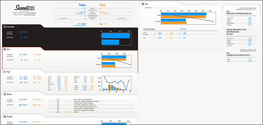 Die folgenden Funktionen ermöglichen es, mit Sweetviz schnell und einfach umfangreiche visuelle Analysen anzubieten: .