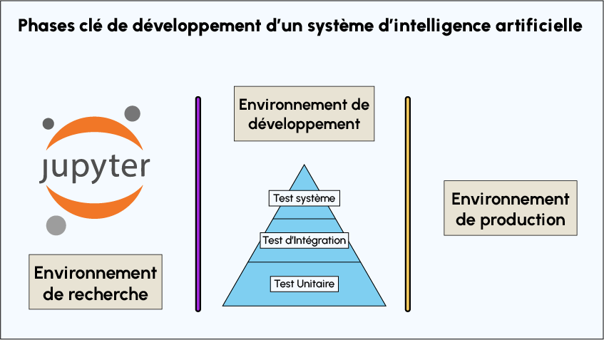 - Die Forschungs- und Entwicklungsumgebung: Hierbei handelt es sich meist um das Jupyter Notebook, das zur Entwicklung der verschiedenen Modelle und Ansätze verwendet wird. Obwohl es technisch möglich ist, Unit-Tests für grundlegende Funktionen (z. B. einer Klasse in Python) zu erstellen und durchzuführen, werden die meisten Unit-Tests in der Regel in den Entwicklungs- und Produktionsumgebungen durchgeführt.
