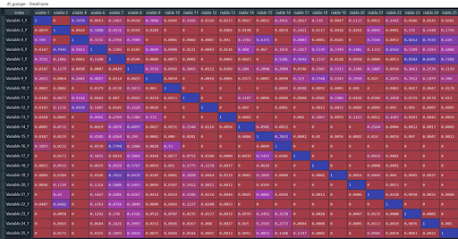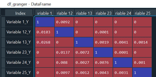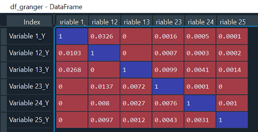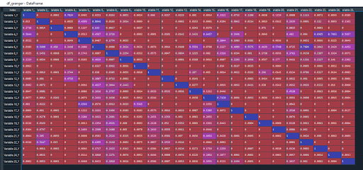 Da mein bester MAE bei einem maxlag von weniger als 67 erzielt wurde, d.h. dem höchsten lag, mit dem ich meine Granger-Tests durchgeführt habe, muss ich meine Granger-Matrix mit einem lag von 44 erneut testen. Wir werden also unsere df mit maxlag = 44 erneut testen, und ich erhalte folgendes Ergebnis: