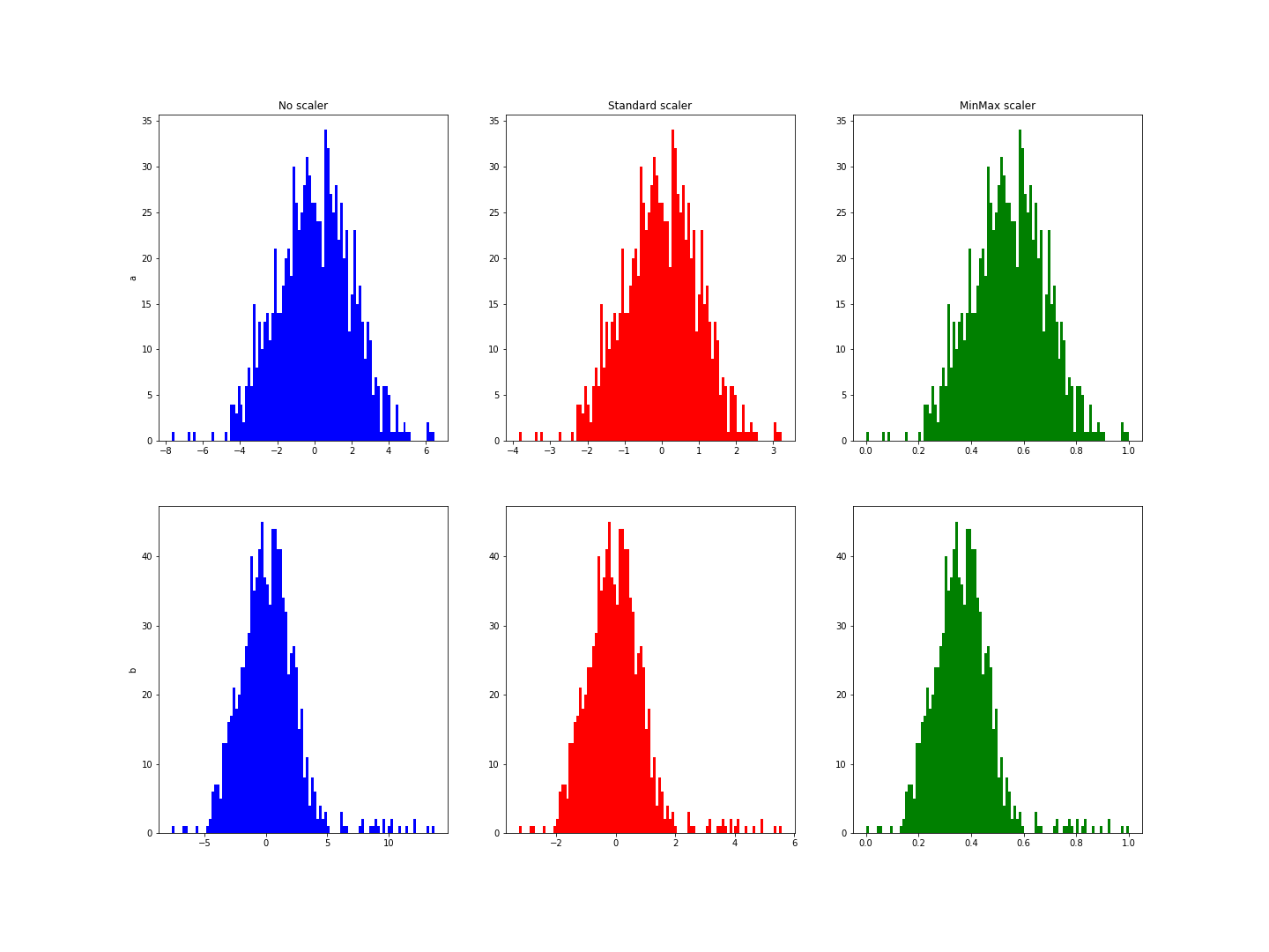 Der Hauptunterschied zwischen der Standardnormalisierung und der Min-Max-Normalisierung liegt in den Fällen, in denen extreme Werte gefunden werden. Bei der Standardnormalisierung wird eine Normalverteilung der Variablen angenommen, um die Werte für die Mehrheit zwischen -1 und 1 zu reduzieren. Im folgenden Beispiel hat die Variable b einige extreme Werte. Es fällt auf, dass die Normalisierung die Werte nicht auf dieses Intervall reduziert:
