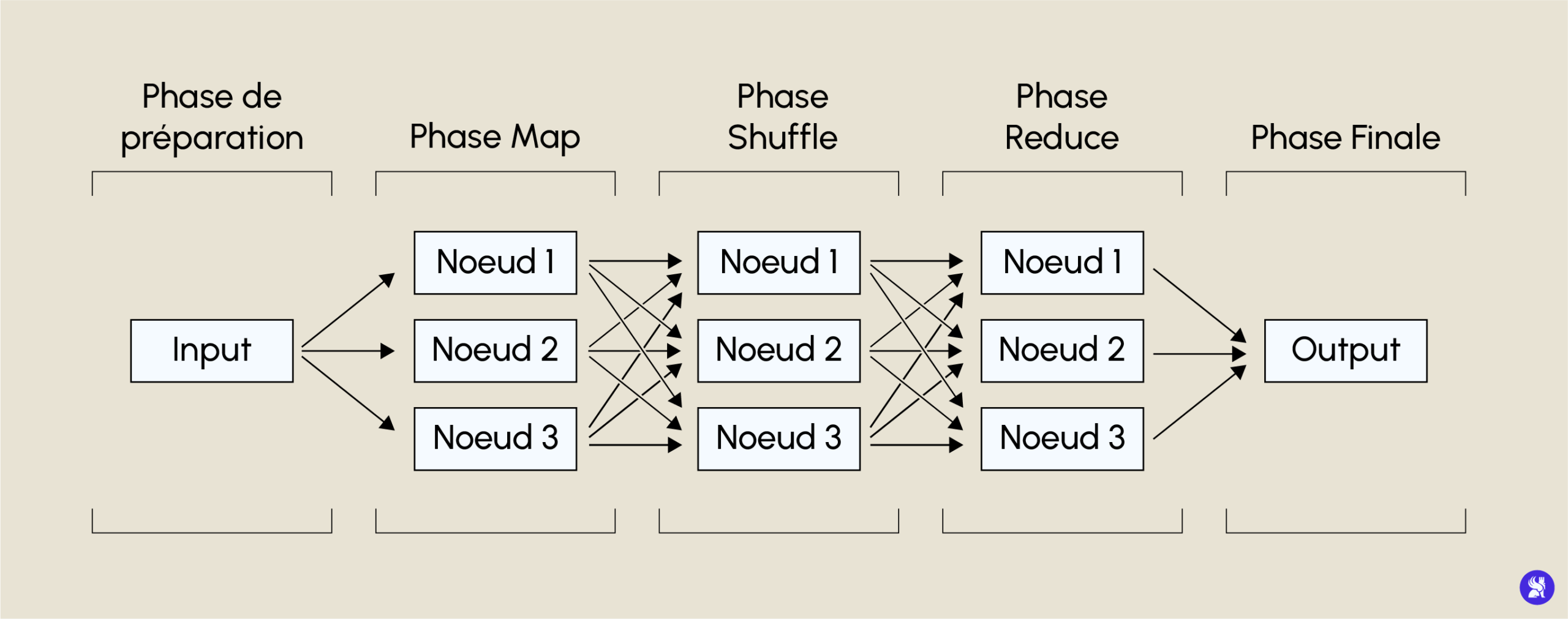 Danach folgt die Shuffle-Phase, in der die Ergebnisse der verschiedenen Aggregationen nach diesem Schlüssel sortiert werden. Dann gibt es die Reduktionsphase, in der die Anfrage (z. B. eine Summe) auf unsere verschiedenen sortierten Schlüssel angewendet wird. Schließlich gibt es noch die letzte Phase, in der unsere verschiedenen Reduktionen erneut in einem einzigen Knoten zusammengefasst werden.