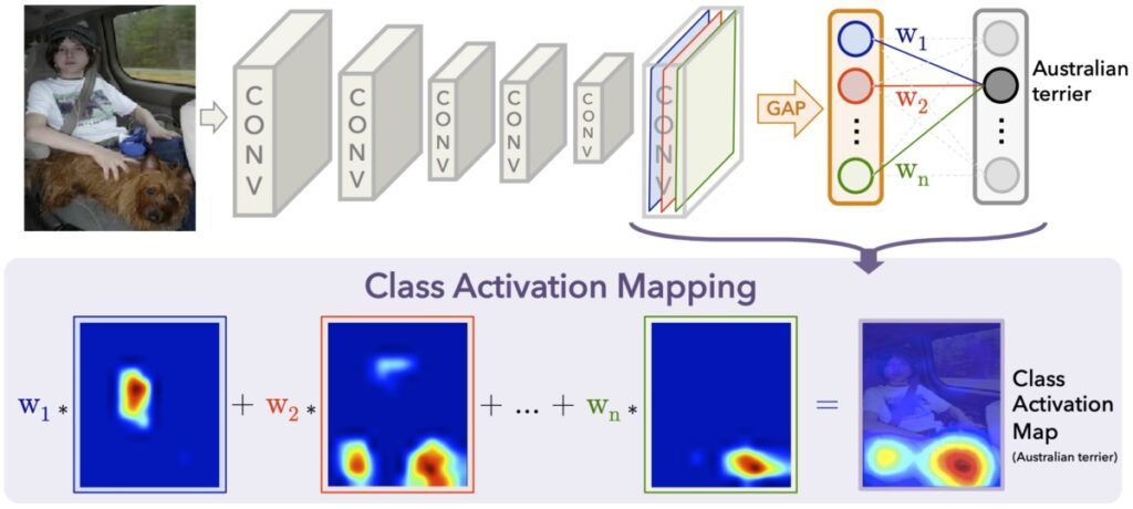 Die Klassenaktivierungskarte weist jeder Position (x, y) in der letzten Faltungsebene eine Wichtigkeit zu, indem die Linearkombination der Aktivierungen berechnet wird, gewichtet mit den entsprechenden Ausgabegewichten für die beobachtete Klasse (Australian Terrier im folgenden Beispiel). Das resultierende Klassenaktivierungs-Mapping wird dann wieder auf die Größe des Eingabebildes skaliert. Dies wird durch die folgende Heatmap veranschaulicht.