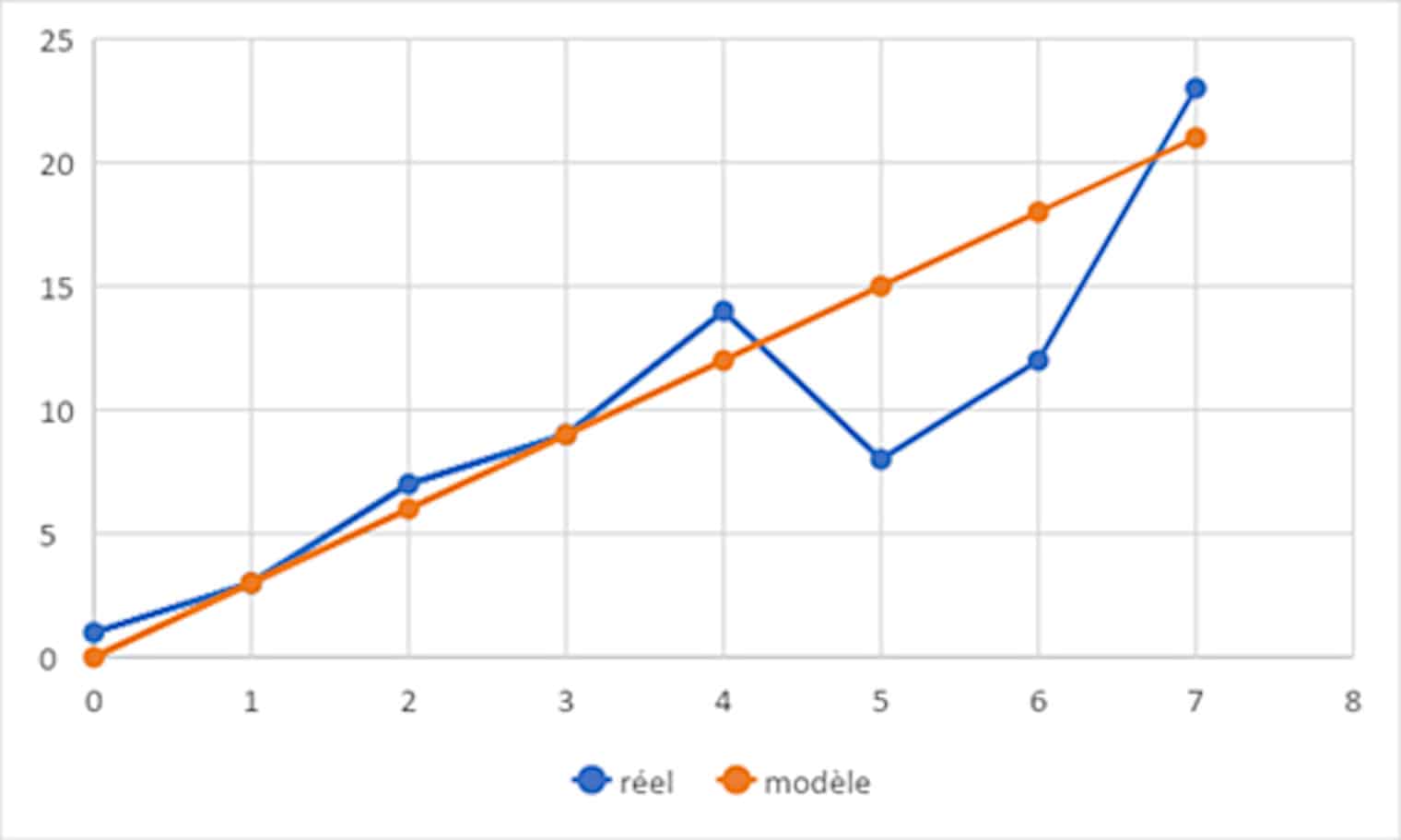 Die blauen Punkte sind die beobachteten Werte und die orangefarbene Regression ist das vom Data Scientist erstellte Verhaltensmodell. Berechnen wir den mittleren quadratischen Fehler des Modells :