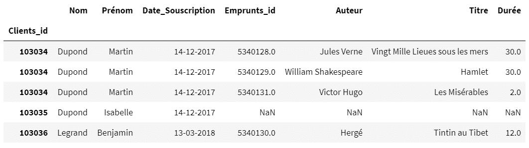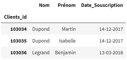 So verwendet er eine Tabelle „Kunden“, die für jeden Kunden seine Kennung, seinen Vornamen, seinen Nachnamen, seine Adresse und das Datum seines letzten Abonnements in der Mediathek enthält.