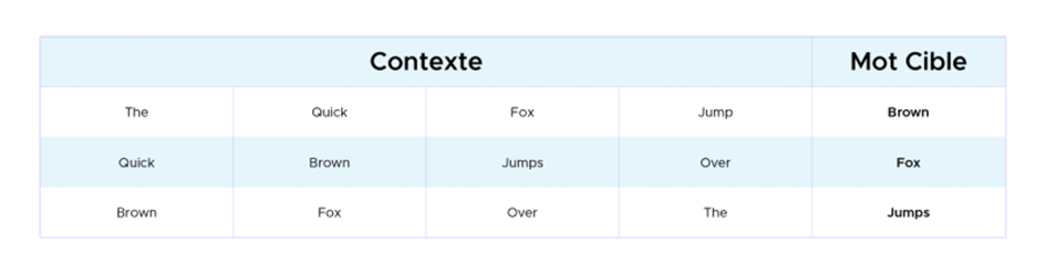 In der folgenden Abbildung wird das Wort im blauen Feld als Zielwort bezeichnet und die Wörter in den weißen Feldern werden als Kontextwörter in einem Fenster der Größe 5 bezeichnet.
