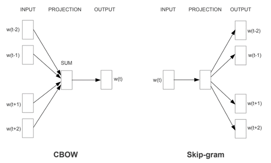 Es gibt zwei Varianten des Word2vec, beide verwenden ein neuronales Netz mit drei Schichten (1 Eingabeschicht, 1 verborgene Schicht, 1 Ausgabeschicht): Common Bag Of Words (CBOW) und Skip-gram.