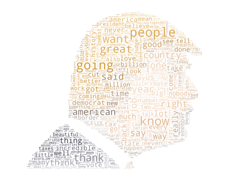 Wenn wir zum Beispiel eine Reihe von Tweets über Präsident Donald Trump analysieren, können wir unserer Wortwolke eine Form geben, die die Form seines Gesichts aufgreift, was ebenfalls informativ ist.