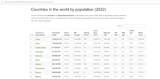 Prenons un exemple simple pour se familiariser avec ces notions. L’exemple suivant a été pris sur Kaggle et le but est de scraper des données sur la population dans le monde. Les données sont disponibles sur le site Worldometer, une open source géré par une équipe internationale de développeurs et chercheurs bénévoles, dont l’objectif est de mettre les statistiques mondiales à disposition d’un large public dans le monde entier.