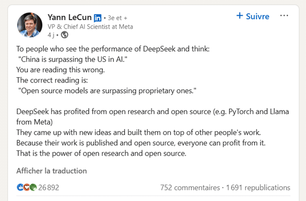 Cette stratégie est même saluée par Yann LeCun, scientifique en chef de l’IA chez Meta, qui voit en DeepSeek “une validation de l’open source comme norme dominante” dans le futur de l’intelligence artificielle. Le succès de la startup chinoise met en lumière les failles des modèles propriétaires et pourrait obliger les Big Tech à réévaluer leur stratégie.