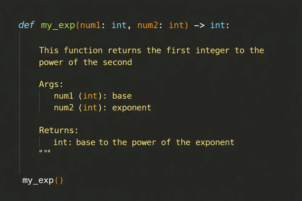 L’extension autoDocString vous permet de créer le corps de votre DocString automatiquement. Il suffit d’écrire votre fonction, vous pouvez spécifier le type de vos paramètres ainsi que le type du retour. Puis, en dessous de la fonction, commencez à taper les 3 guillemets (« » ») et autoDocString vous proposera de remplir la DocString de votre fonction.
