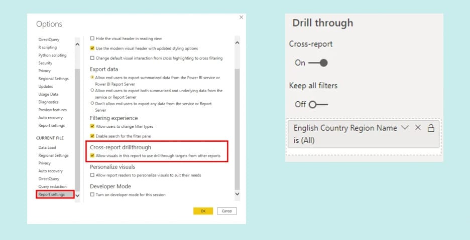 Pour activer la conservation des filtres appliqués, rendez-vous dans la section Drillthrough du panneau de visualisation et activez l’option « Garder tous les filtres » en plaçant l’interrupteur sur « On ».