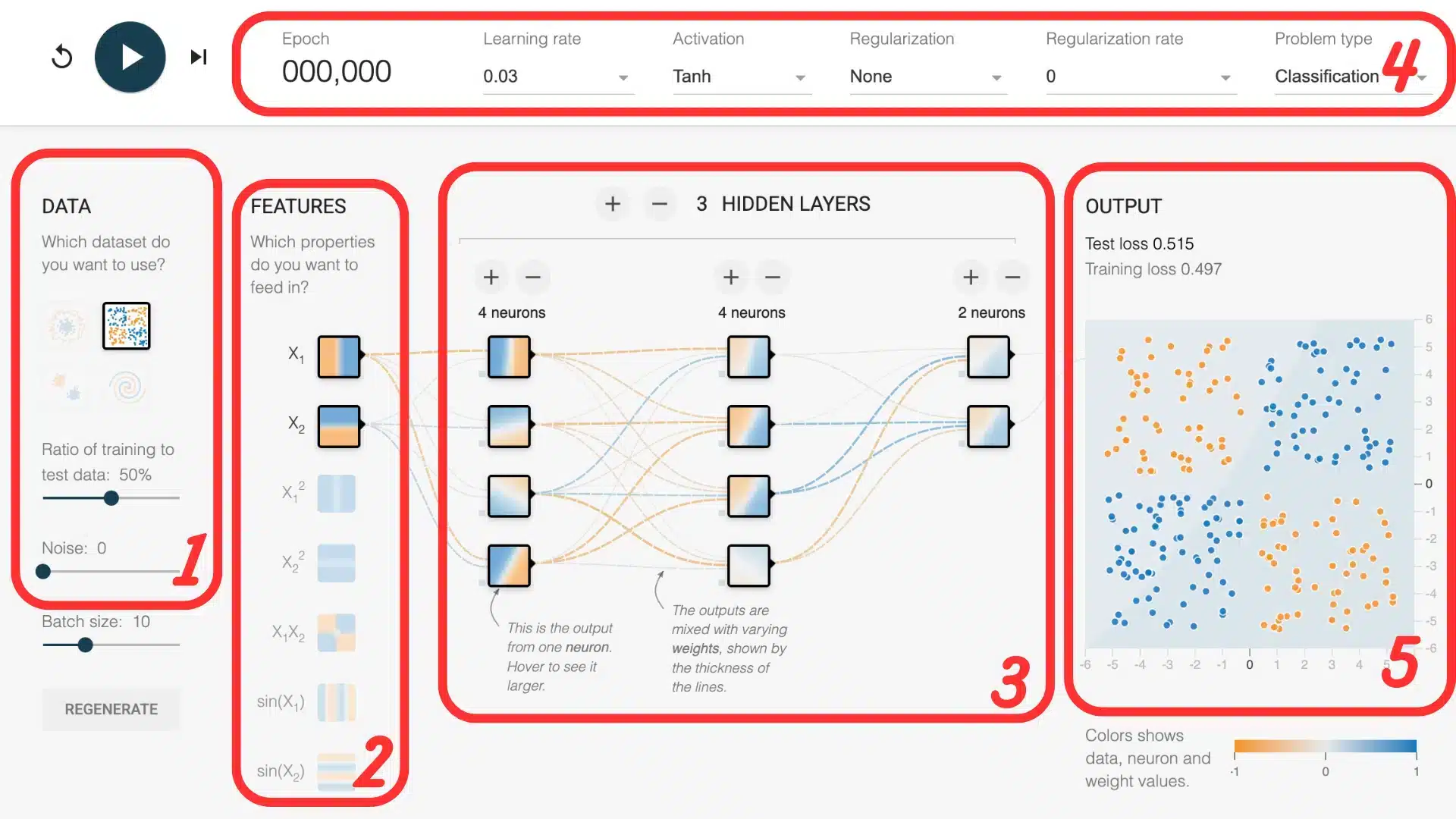 Start the training: the boundary is chaotic at first. It’s up to you to find a combination of layers, neurons, activation function, or even regularization, that allows the network to follow the pattern curves. It’s a good way to see how depth or a small parameter change can make a significant difference.