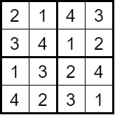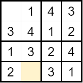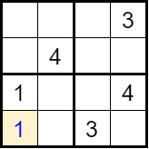 Step 1 – Choice: Start by choosing an empty square in the grid. Fill this square with a possible number (from 1 to 4).