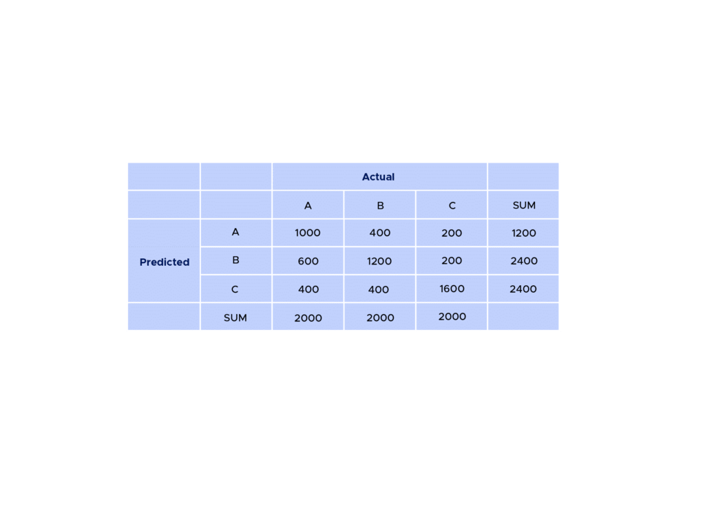 – For individuals in class B, 1200 out of 2000 were correctly identified as belonging to this class.