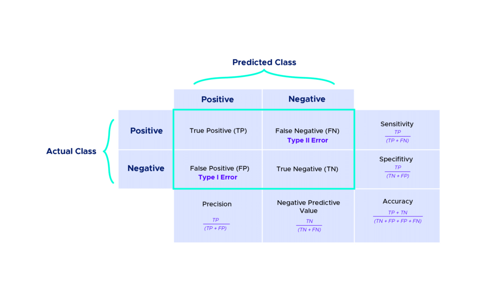 - False Positive (FP): The prediction is positive, but the actual value is negative. Example: A healthy person predicted as sick.