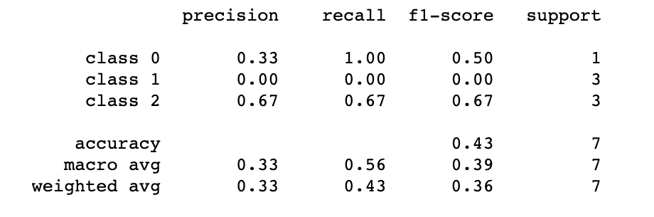 In our case, we can observe a Precision of 0 for class 1. This is simply because no individuals from real class 1 are predicted as belonging to that class. In contrast, for individuals in class 2, where 2 out of 3 were correctly assigned to class 2, we have a Precision of 0.67.