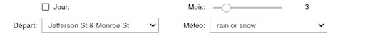 The menu allows you to select the starting station for the trips, the weather on the day the trips were made and the month in which they took place. The histogram can be divided into days, with or without a check mark.