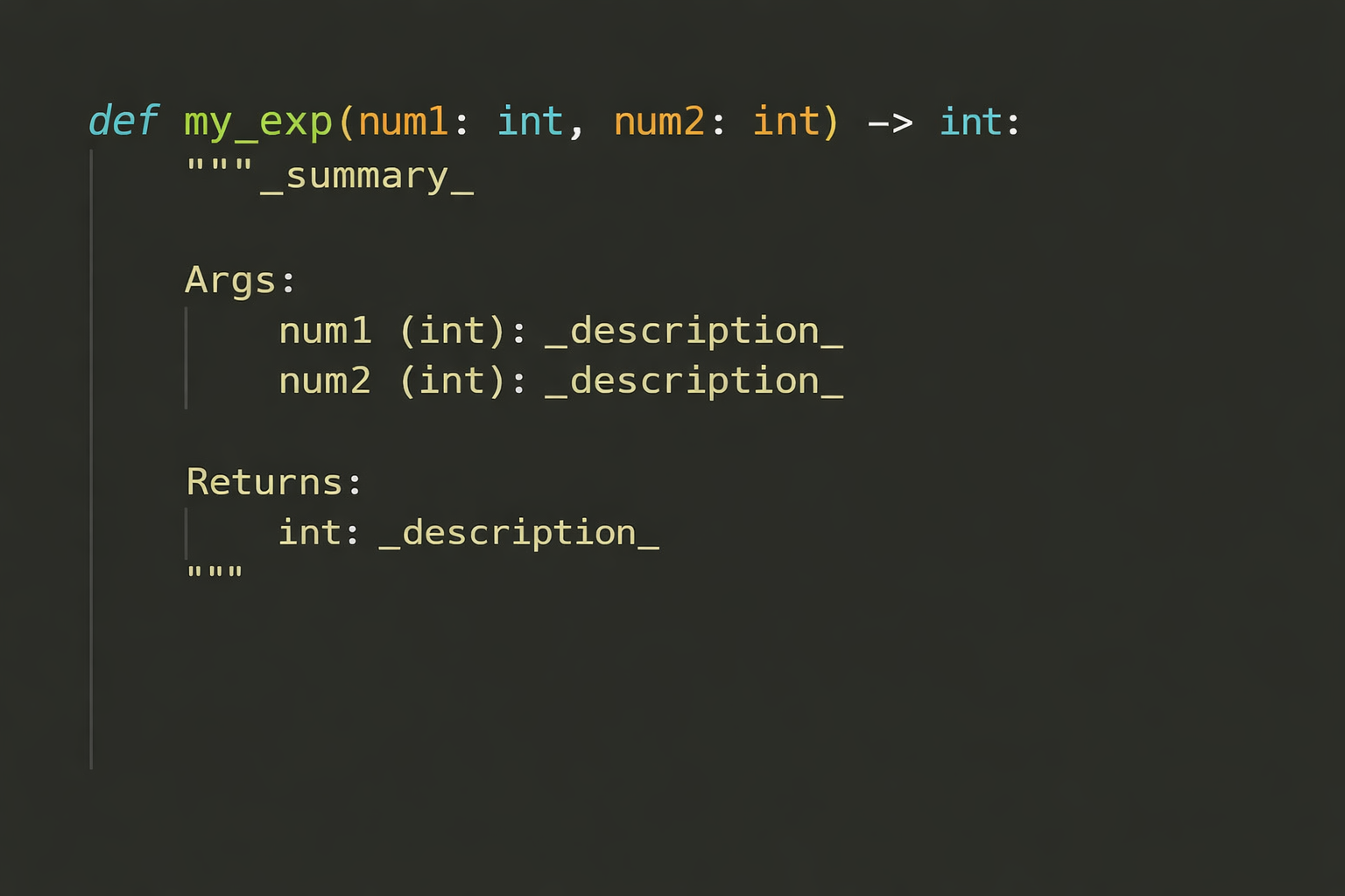 The autoDocString extension allows you to create the body of your DocString automatically. Just write your function, you can specify the type of your parameters and the type of return. Then, below the function, start typing the 3 inverted commas (“””) and autoDocString will suggest that you fill in the DocString for your function.