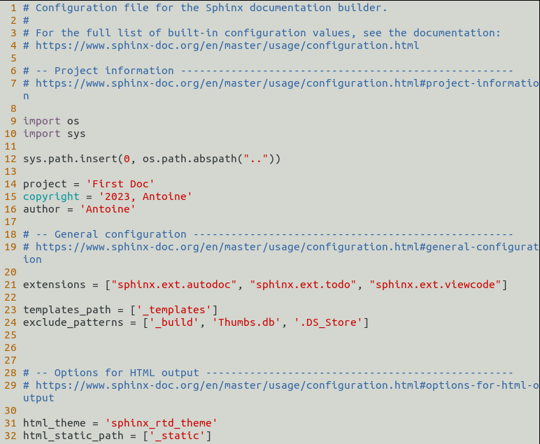 8. Now edit the “docs/conf.py” file, which should look like this: