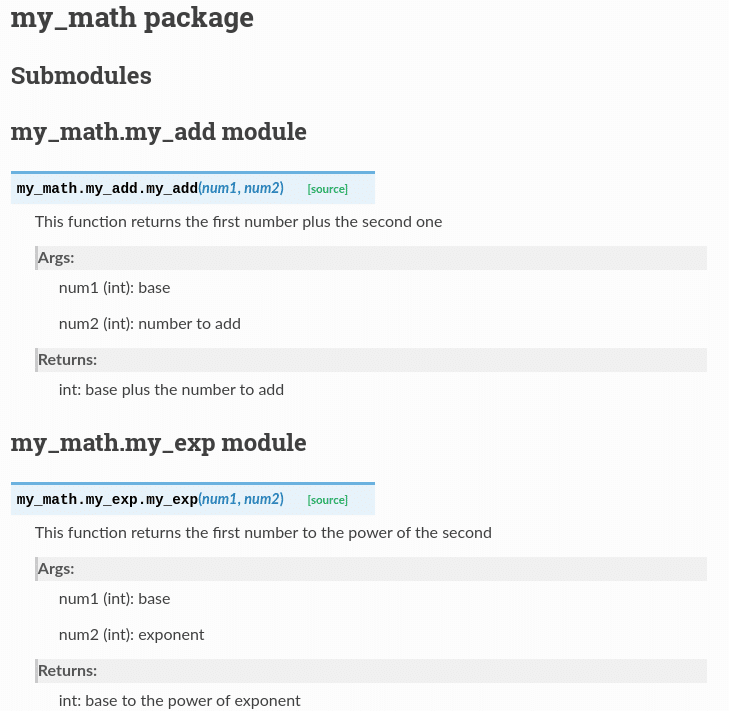 9. Finally, in the docs/ folder, run the “make html” command. You will find the html files in this docs/_build/html folder. Open the “index.html” file from your file manager and then click on “my_math package”. The result should look something like this: