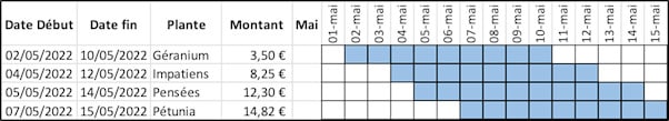 Show the start and end dates of plant sales on a schedule as above. Freeze the column for the start and end dates and the row for the month dates with mixed references and use the AND function.