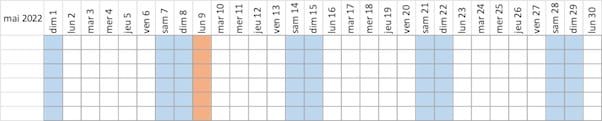 Set a mixed reference by freezing the line containing all the dates of the month and use the Joursem function, which returns a number from 1 to 7 from Sunday to Saturday.