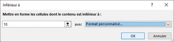 When you select “less than”, you can enter a maximum amount (e.g. 10) below which the values will be highlighted, as shown below: all plants priced under €10 will be highlighted using the custom format you’ve chosen. Here, cells meeting this criterion are highlighted in blue with red characters.