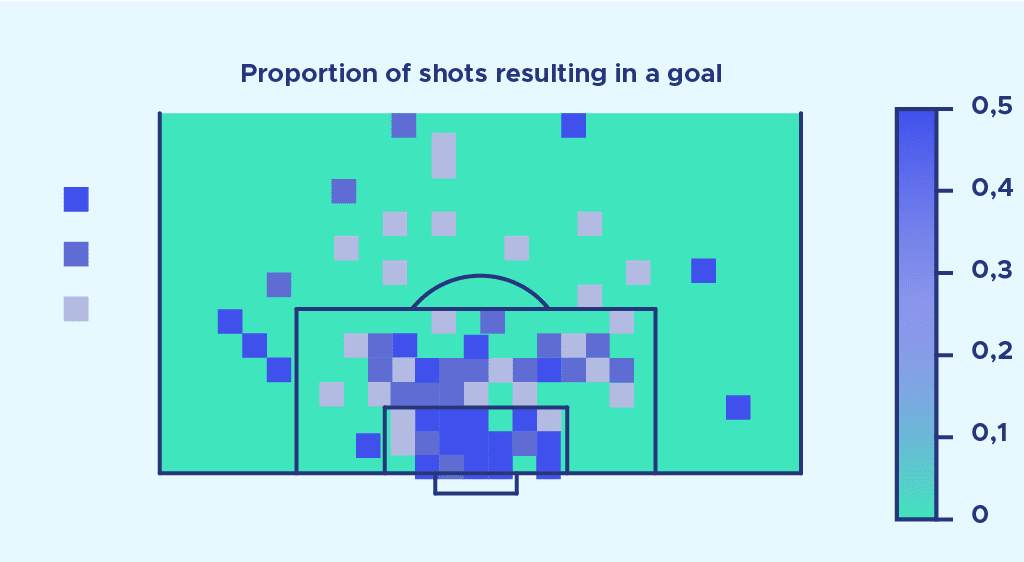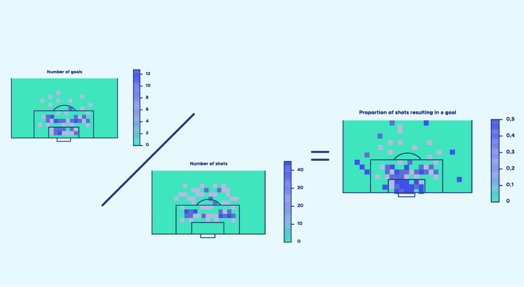 Now let’s remember that our aim is to establish a goal probability for each shot. To do this, we calculate the ratio number of goals/number of shots number of goals number of shots for each gridded area of space. This ratio is our probability of scoring. We then display this probability for each zone of the space, and here’s the result: