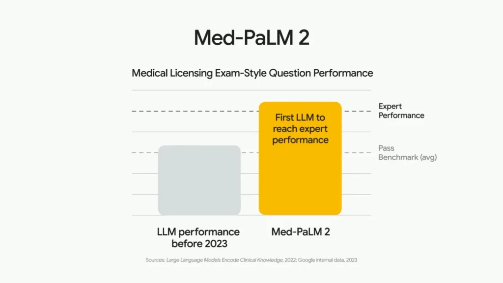 Besides very advanced general knowledge, PaLM 2 has several variants. These variants provide it with much more knowledge depending on the chosen domain. Thanks to a variant called “fine-tuning” it can answer questions and problems of cybersecurity like detecting threats or malicious scripts. Another example is medicine with “Med-PaLM 2” which allows it to interpret an X-ray image.