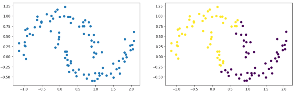 Indeed, datasets with elliptical shapes, for example, can pose a problem. In the example below, we clearly see two groups resembling two ellipses. The figure on the right shows the result after using the K-means algorithm. It’s evident that it failed to identify our two ellipses.