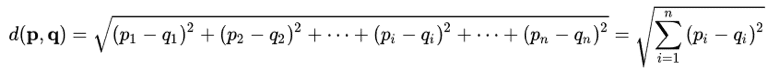 In the k-means algorithm, the Euclidean distance is generally used, where p = (p1,…,pn) and q = (q1,…,qn).