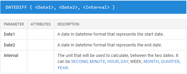 The “start_date” parameter is a scalar date or time value, in the same way as the “end_date” parameter. The ‘interval’ parameter is the interval to be used to compare dates, and can be ‘SECOND’, ‘MINUTE’, ‘HOUR’, ‘DAY’, ‘WEEK’, ‘MONTH’, ‘QUARTER’ or ‘YEAR’. As a result, Power BI’s DAX DATEDIFF formula returns an integer. This is the number of intervals crossed between the two dates.