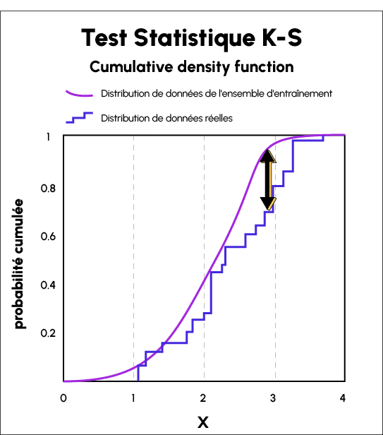 The Kolmogorov-Smirnov statistic is used to quantify the distance between the distribution functions of real-world sample data and the data distributions of the training set.