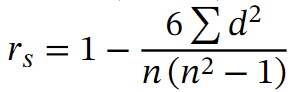 The Spearman correlation is a measure of correlation that measures a monotonic relationship between two variables based on the rank of the data. An example of data rank determination is: [58,70,40] becomes [2,1,3]. Spearman correlation is often used for data consisting of outliers. To measure Spearman correlation, the indicator used is the Spearman coefficient rs, also known as the rank coefficient, given by the formula below. In this formula, the variable n indicates the number of points in the data series. The variable d corresponds to the square of the difference in ranks between each point with coordinates (x,y).