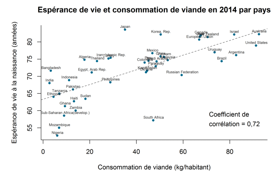 An example of the application of Pearson’s correlation would be the study of the relationship between meat consumption and life expectancy by country.