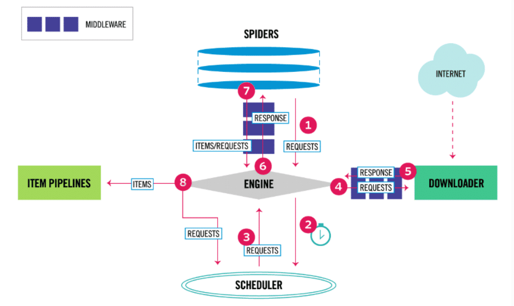At the beginning of the process, communication occurs through Spiders, which allow the transmission of requests (containing the URLs to be scraped and the information to be extracted) to the engine.