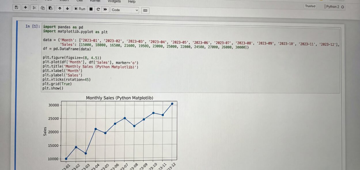 Una vez listos el código y los datos, es necesario poder visualizar los resultados. En Python, Matplotlib es la biblioteca estándar para visualización (2D). Permite crear todo tipo de gráficos (curvas, histogramas, barras, nubes de puntos, etc.) con un control detallado sobre su apariencia (títulos, leyendas, colores). Por ejemplo, Matplotlib produce gráficos de calidad en todos los formatos y entornos. En la práctica, se usa frecuentemente a través de su interfaz pyplot para montar rápidamente un gráfico lineal de la evolución de ventas a lo largo del tiempo, o un histograma de la distribución de una variable. Para visuales más “vistosos” y contemporáneos en Python, también se pueden usar Seaborn y Plotly, pero Matplotlib sigue siendo la base robusta e imprescindible.