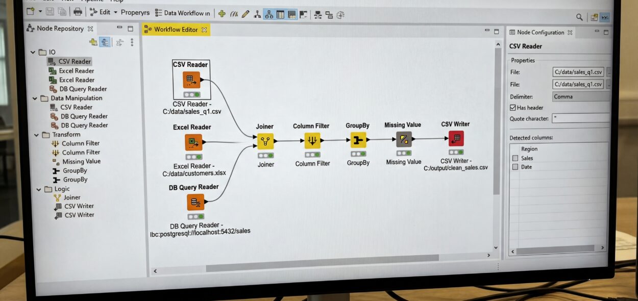 Como alternativa (particularmente en no-code/low-code), existen plataformas como KNIME Analytics Platform. KNIME es un software ETL open source gratuito que funciona mediante arrastrar y soltar “nodos” de datos. Según KNIME, su plataforma asegura procesos ETL potentes, escalables y reproducibles. Concretamente, un analista puede, sin programar, recuperar fuentes diversas (Excel, base SQL, API Web), luego arrastrar módulos para filtrar, agregar, unir, limpiar y finalmente exportar a otras herramientas (por ejemplo, enviar el resultado a Power BI o una base de datos). Es muy útil para aquellos que prefieren una interfaz visual: se ve el flujo de datos como un diagrama de flujo, lo que puede hacer más intuitivo el tratamiento de grandes volúmenes o la creación de pipelines reutilizables. KNIME o herramientas como Alteryx/Power Query pueden ser preferidos para tareas donde se desea montar rápidamente un ETL sin escribir un código extenso.